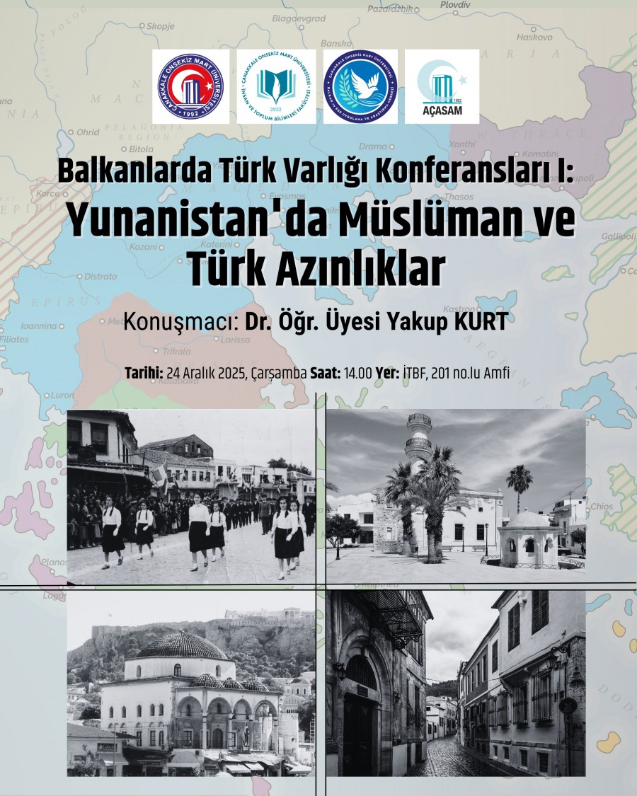 Merkezimiz ile İnsan ve Toplum Bilimleri Fakültesi, Tarih Bölümü ve Atatürk ve Çanakkale Savaşlarını Araştırma Merkezi iş birliğinde Balkanlarda Türk Varlığı Konferansları serisi kapsamında 24 Aralık 2025 tarihinde İTBF, 201 no.lu amfide Yunanistan’da Müslüman ve Türk Azınlıklar başlıklı bir konferans düzenlenecektir. Konferansa Dr. Öğr. Üyesi Yakup Kurt konuşmacı olarak katılacaktır.