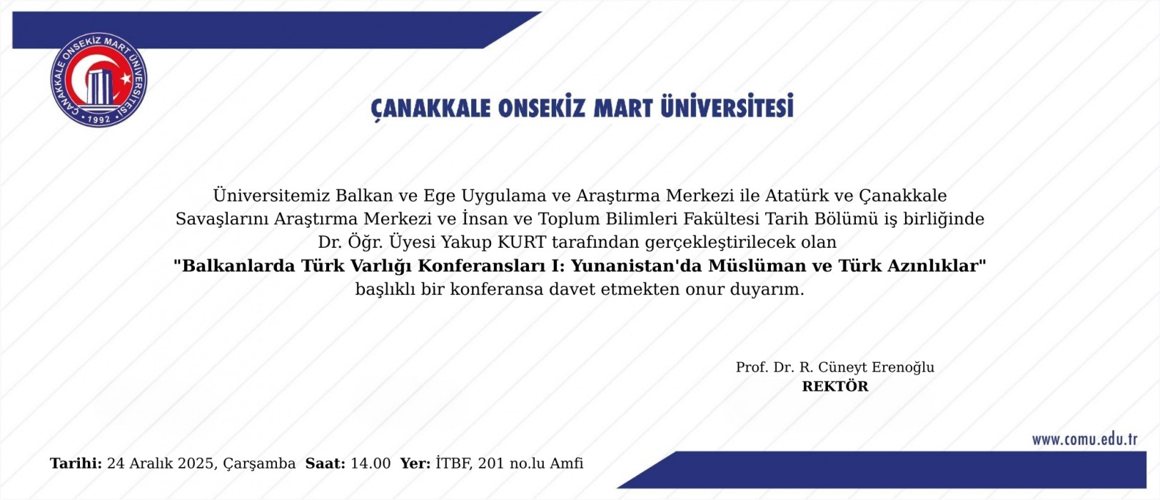 In collaboration with our Center, the Faculty of Humanities and Social Sciences, the Department of History, and the Atatürk and Gallipoli Research Center, a conference titled "Muslim and Turkish Minorities in Greece" will be held on December 24, 2025, in Amphitheater 201 of the Faculty of Humanities and Social Sciences, as part of the Turkish Presence in the Balkans Conferences series. Dr. Yakup Kurt will be the speaker.